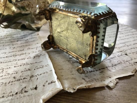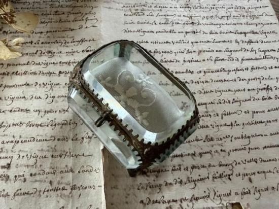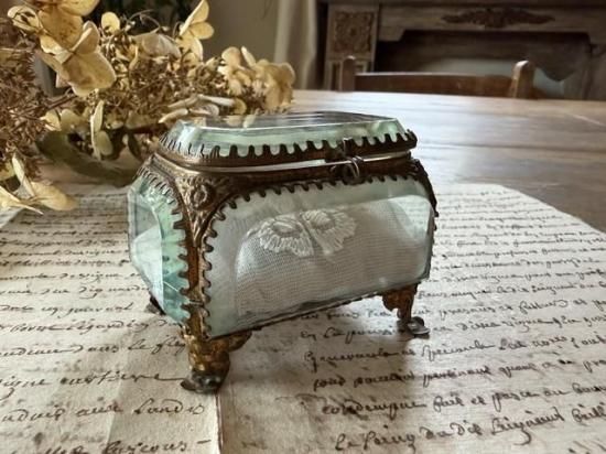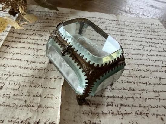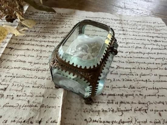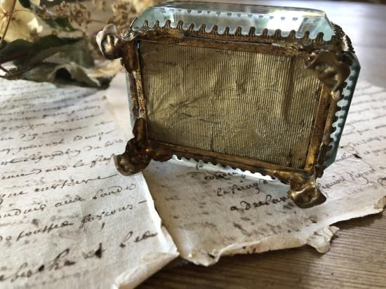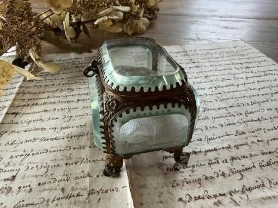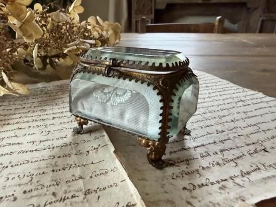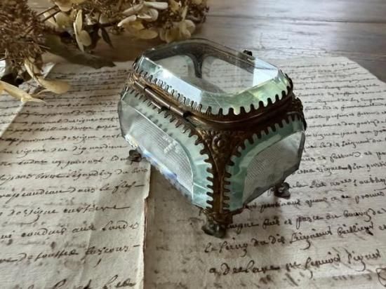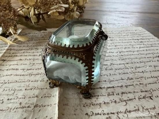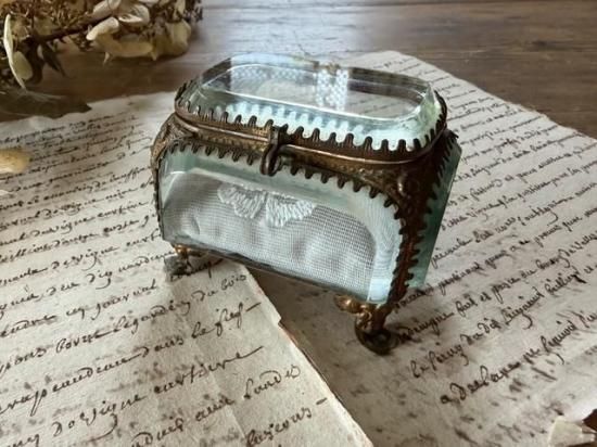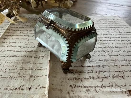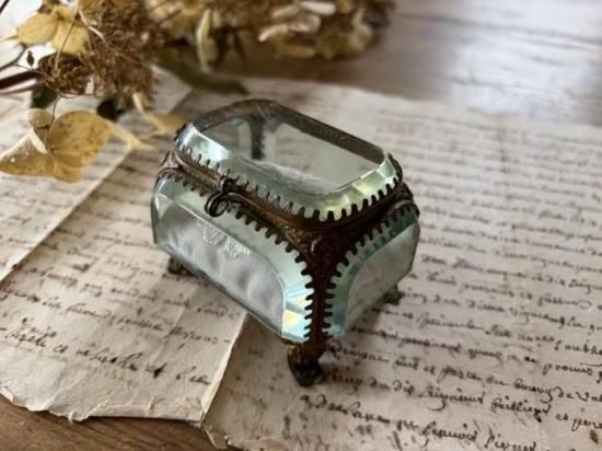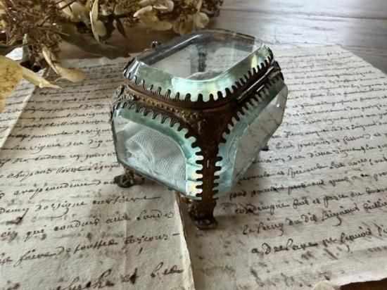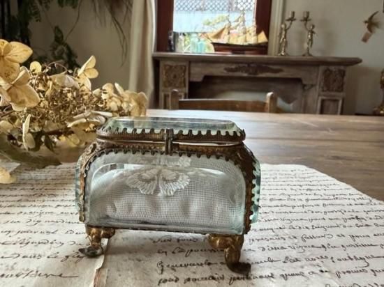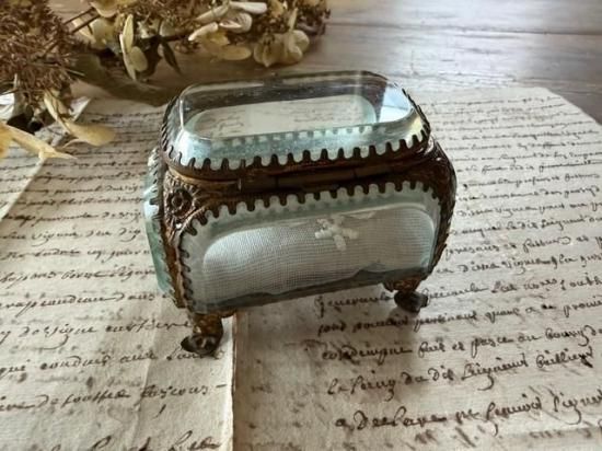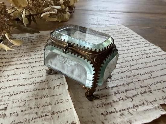 当時のままの、4つの真鍮の足に支えられたバベルガラスの宝石箱。