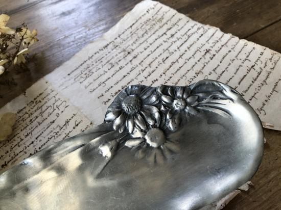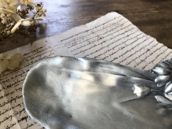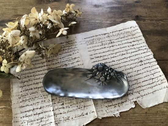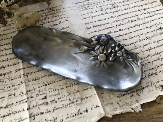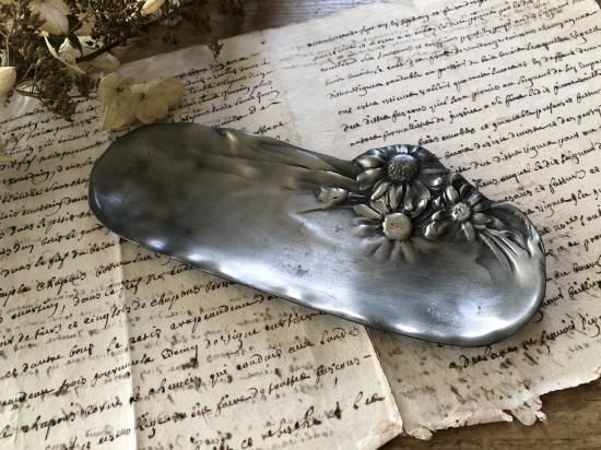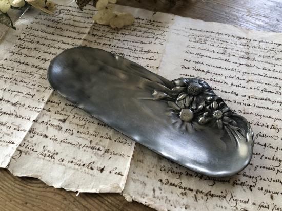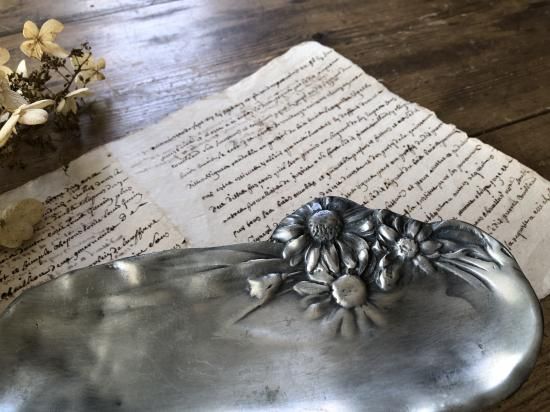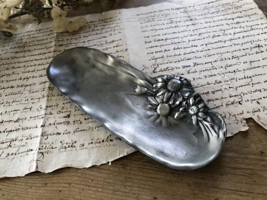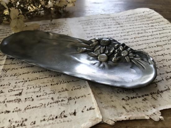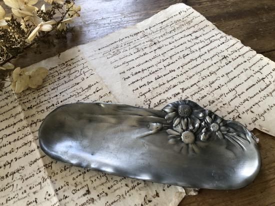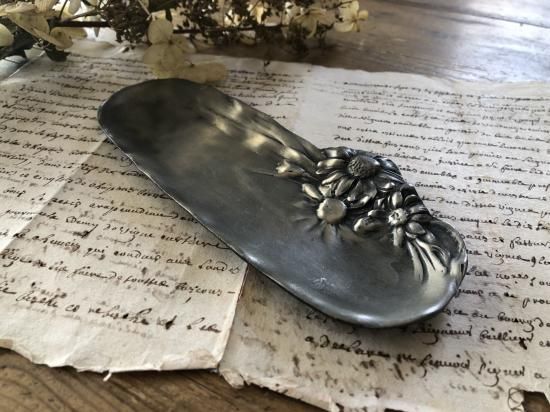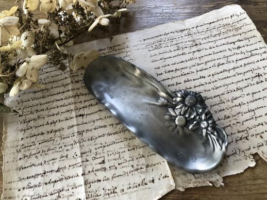 フランス/ETAIN FIN92%刻印のマムの花のピュータートレイ「A」