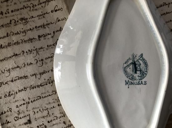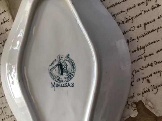 サンタマン(Saint Amando)がフランス北部、ベルギーに近いノール県のサンタマン・レゾー(Saint-Amand-les-Eaux)に、ニコラス・デムウティエールよって1705年に創業。スカーぺ川の粘土を採取、近くの森から窯のために木材を得て、完成した陶器はスカーぺ川で運ぶことができると言う陶器制作に恵まれた土地で、ファイアンス焼きを始めます。花や動物の絵柄や伝統的なブルー&ホワイトの作品が作られていきました。その後、さまざまなオーナー遍歴を繰り返し、またフランス革命によって工場が閉鎖するなど時代の波をくぐり抜けながら、1928年ムーラン・デ・ル・アマージュと名前を変更。1944年にはさらに、ムーランデルーと名前を変更します。このとき会社は国内に5カ所展開していましたが、時代の変化に応じながら1952年からひとつずつ工場を閉鎖し、1962年には最後の工場を閉鎖してその歴史に幕を降しました。様々な遍歴を繰り返してきたためさまざまな作風と多くの刻印が存在します。現在では作陶の起源である地名の名前を取って総称してサンタマン=レゾーの陶器と呼ばれています。現在のアンティーク市場では1880年以降の作品が主となっています。