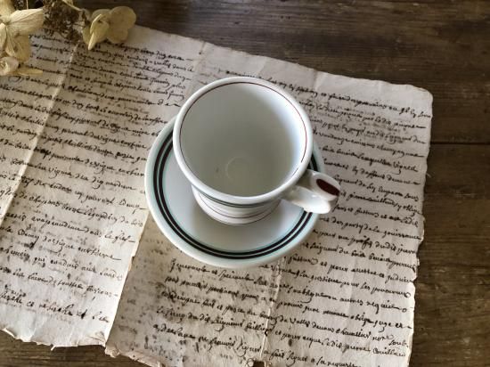 コンディション:カップの裏面高台に経年の汚れ(最後の画像)、縁取りの上部に微細なスレ(最後から2枚目の画像)があります。