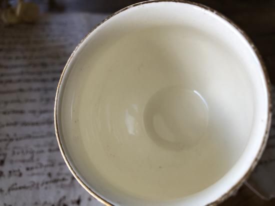 コンディション:貫入は見当たりません。金彩にすれ(最後から2枚目と3枚目の画像)、カップ裏面に窯キズ(最後の画像)があります。