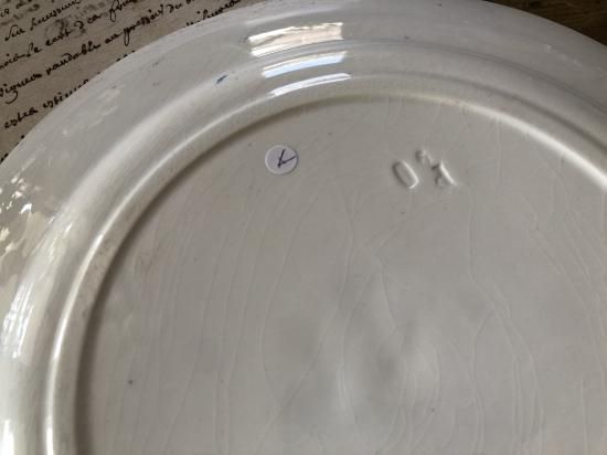 一方、クレイユ窯の創業は1797年頃。英国人起業家のクリストフ・ポッターが経営に加わり、英国ではすでに発明されていた、陶器や磁器に印刷をする技術を、フランスではクレイユとジョワジー・ル・ロワが初めて導入し、窯は大きく発展します。この頃、新古典主義の作品が次々作られていきます。さらにその後新たな技術者が加わりながら発展し、オーナーの交代も経ながら(1840年から1874年までは当時合併していたオーナー名の‘Lebeuf Milliet et Cie’の刻印がされています。)1819年頃にモントロー工場を買収した形でクレイユ・エ・モントローとなります。