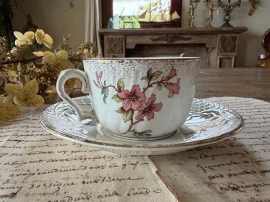 カップにはレースのドレーブのような波があり、ソーサーにはロカイユのレリーフが施された、エレガントな魅力のあるカップ&ソーサーです。