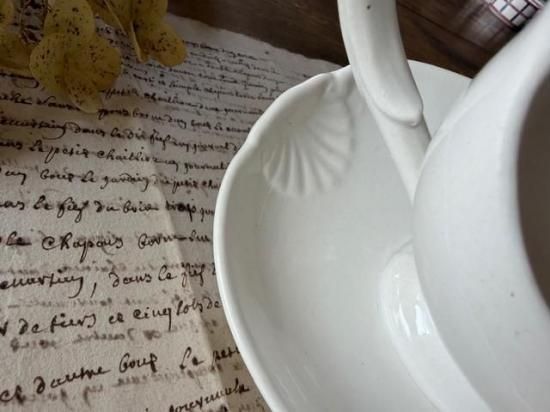 植物装飾のハンドルと貝殻レリーフの受け皿が素敵です。