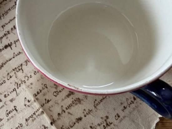 ごくわずかに貫入があり、裏面に灰粒点、高台にスレ、カップ縁取りに古いチップ、微細なインク汚れがあります。