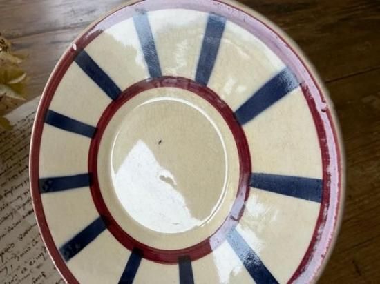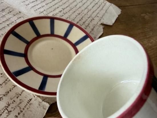 コンディション:カップとソーサーに貫入があり、カップ裏面高台にスレ感(最後から2枚目の画像)と縁取りにシミ(最後の画像)、ソーサーは全体的にシミまたは色づきがあります。