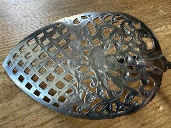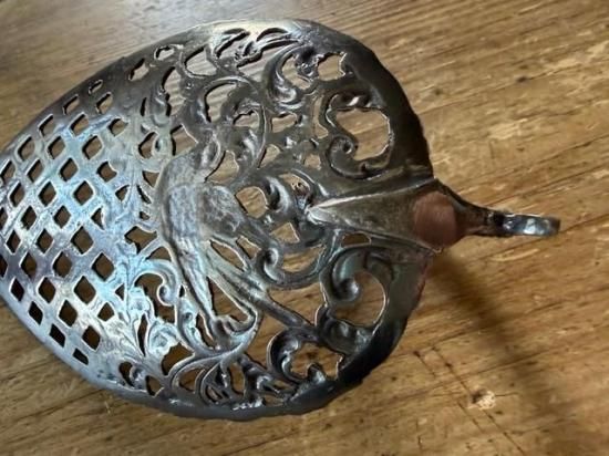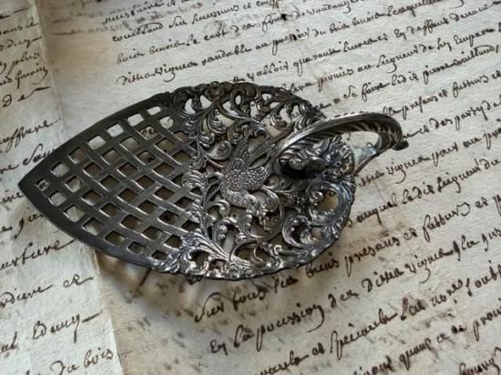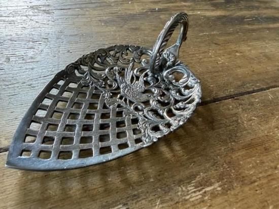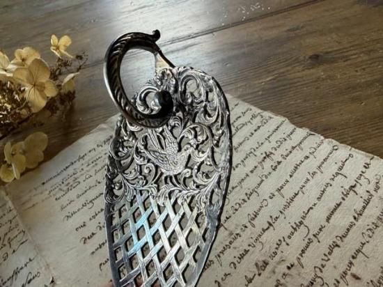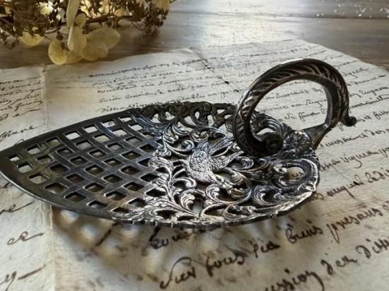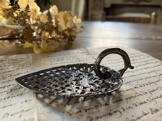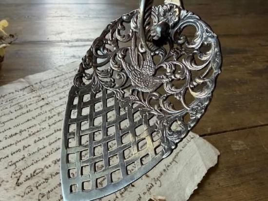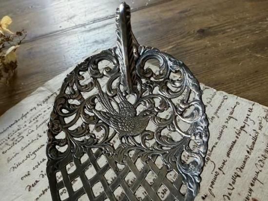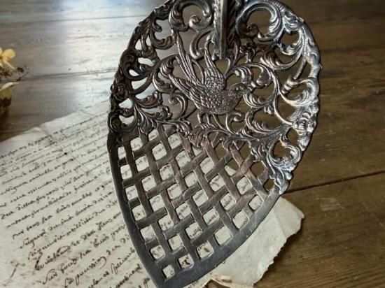 ロカイユ調の植物の中央に可愛らしい小鳥が尻尾を上げた姿で心をくすぐるサーバー。