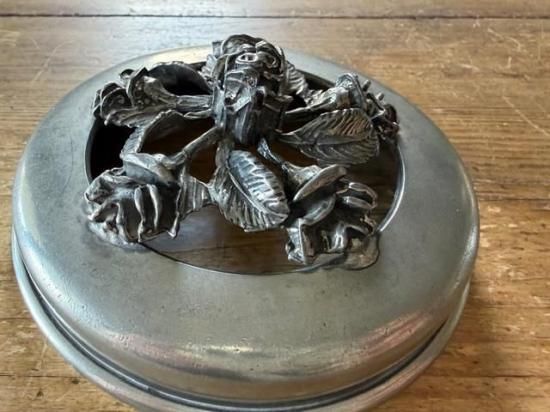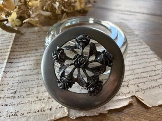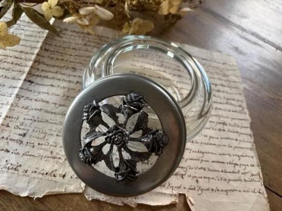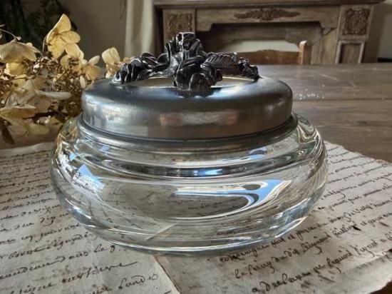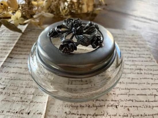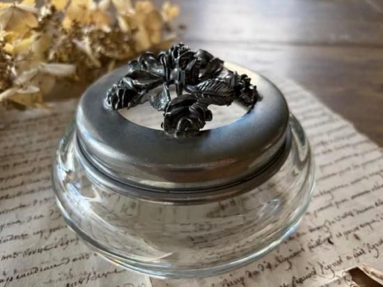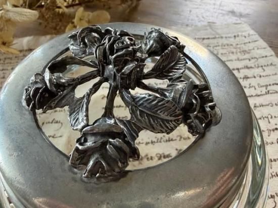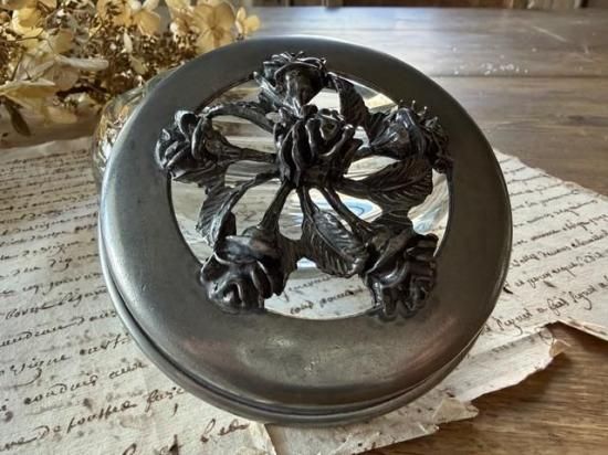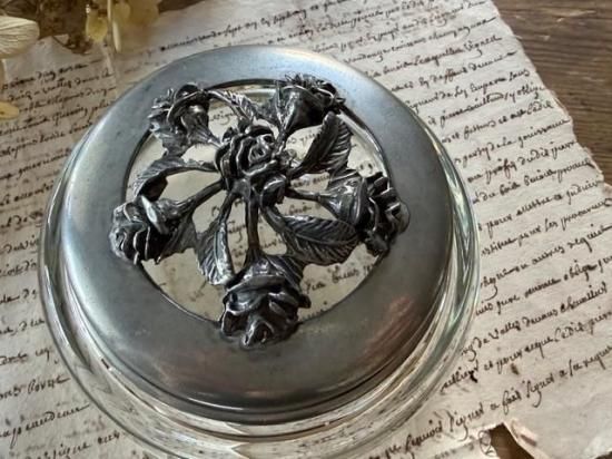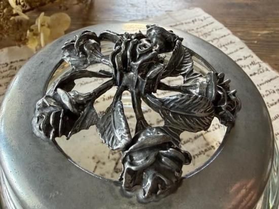 フランス/薔薇の装飾のピューターとガラスの大きなポプリポット