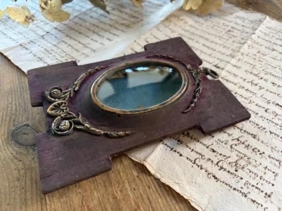 時を経て、ベルベットの土台に装飾が施されたアンティークな姿になっています。